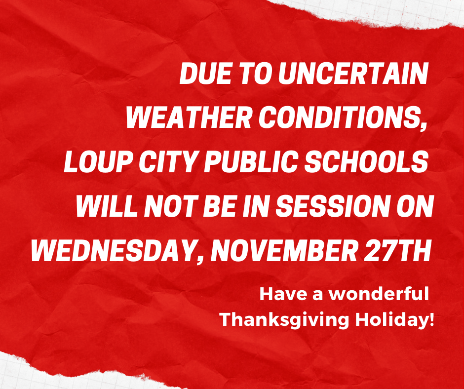 Due to the forecast of impending winter weather Loup City Public Schools will not be in session on Tuesday, November 26th.